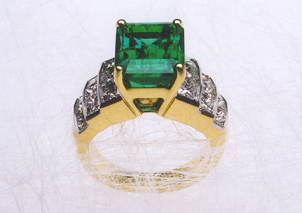 EC-203 Lady's 18-Karat Yellow Gold Ring, central 4.27 carats natural emerald cut, Colombian Emerald, with very fine color and brilliancy. Measures 10.5 x 8.9 mm. On each shoulder three rows channel set Princess Cut Diamonds, three in each channel, and total weight of 1.75 carats. With color and clarity grade of "F-G & VS1". $26,000.00 |