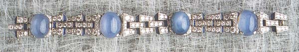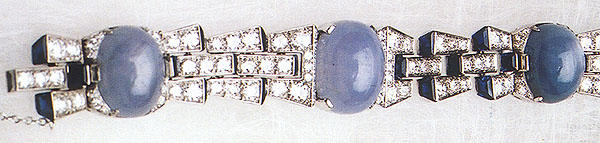ESTATE 102 1920's all hand fabricated Platinum Bracelet with four well matched Blue Star Sapphires. Total calculated weight of 107.00 carats, and 11 square and 26 Whistle Cut Vivid Blue Sapphires. Total estimated weight of 6.50 carats. 122 diamonds with total estimated weight of 13.00 carats. Average color and clarity grade of "G and VS1-2". $38,000.00 |