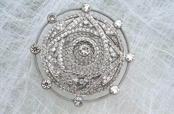 All hand fabricated Victorian style Brooch with hand pierced filigree and pave set diamonds. Total weight of 2.54 carats. F-G and VS1. $13.376.00