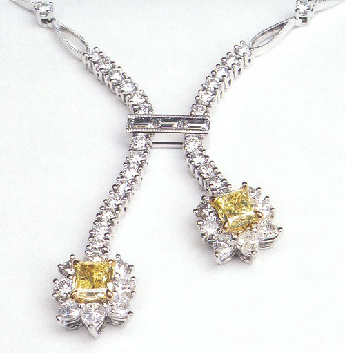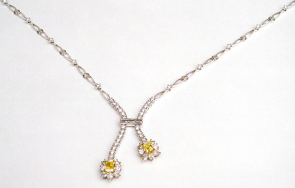 PEC-168 Platinum and 18-Karat Yellow Gold hand fabricated original design Necklace with 2 Fancy yellow Radiant Shape Diamonds, total weight of 0.93 carats, 3 Baguette Cut, total weight of 0.25 carats. 6 Pearshape, total weight of 0.53 carats and 54 Round Brilliant Cut Diamonds, total weight of 2.07 carats. $15,638.00 |