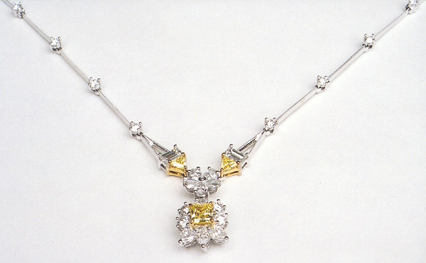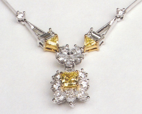 PEC-167 Platinum and 18-Karat Yellow Gold original design Necklace with one Fancy Yellow Radiant Cut Diamond 0.35 carats, 2 Fancy yellow Trillion Cut Diamonds 0.21 carats, 2 Baguette Cut 0.39 carats, 8 Pearshape 0.71 carats, 3 Round Brilliant Cut Diamonds 1.13 carats. Color and clarity grade of "F and VS1". $14,316.00 |