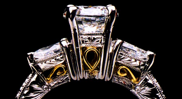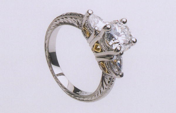 DC-148 Lady's all hand engraved Platinum Filigree Style Ring, central 1.07 carats certified H color, SI1 clarity premium cut and proportion round Brilliant Diamond. On shoulder one Pearshape diamond. Total weight of 0.75 carats. With 18-Karat Yellow Gold Filigree. $9,350.00 |