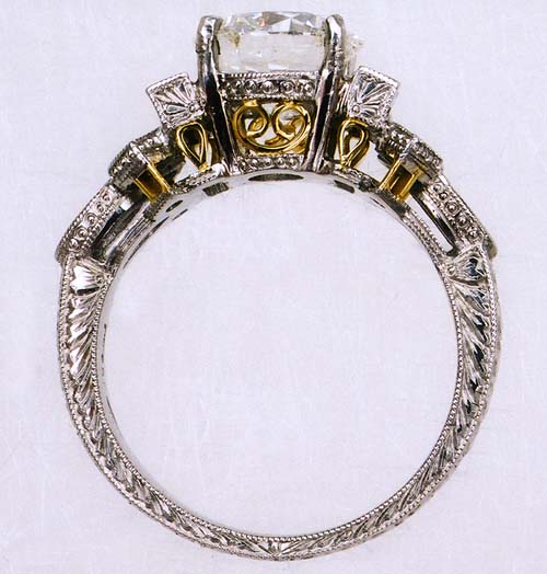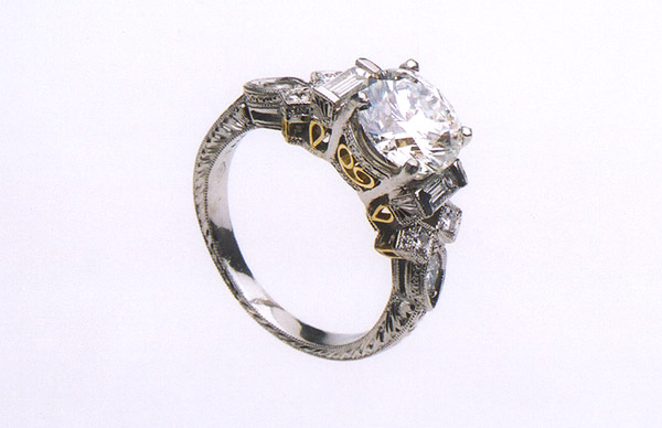 DC-FILLIGREE 201 Lady's Platinum and Filigree Ring. Central 2.21 carats Round Brilliant Premium cut proportion diamond accompanied with "GIA Certificate 1-1 each color and VS2 clarity. On shoulders one Baguette, two rounds and one Marquise shape diamonds with average color and clarity grade of "G and VS". Ring has magnificent detail and workmanship. $22,500.00 |
