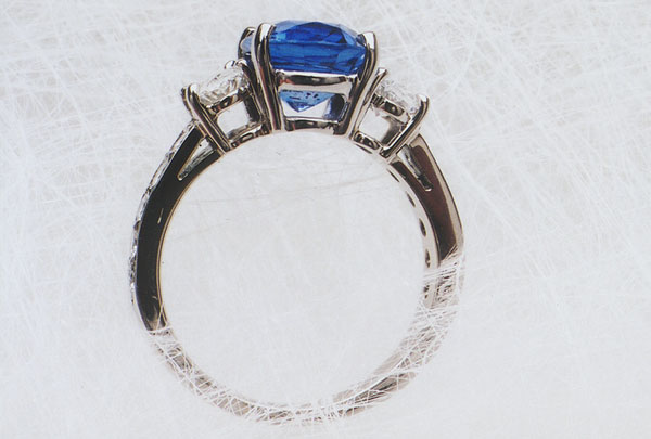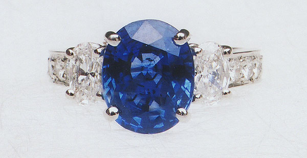 SC-22 Lady's Platinum Ring, with central 3.85 carats Fine Ceylon, Blue Sapphire, and one oval shape diamond on each side. With total weight of 0.85 carats and color and clarity grade of "G & VS2-SIl". By the shoulders on the shank, five round Brilliant Cut Diamonds on each side with total weight of 0.30 carats and color and clarity grade of "G and VS2". $15,000.00 |