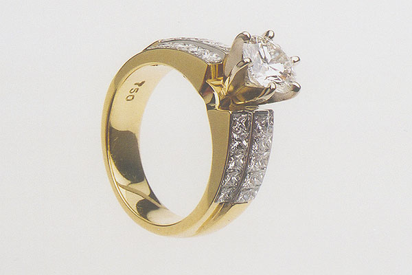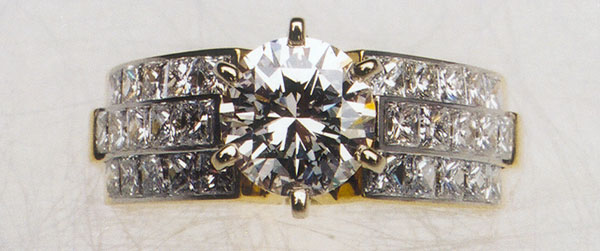 DC-Alma-202 Lady's 18-Karat Yellow Gold Ring. Central 1.08 carat certified, "H color, US2" clarity and very good proportions. Round Brilliant. Three rows of Princess Cut Diamonds. On each shoulder three rows of Princess cut Diamonds in channel set. Total of thirty Princess cuts. With an actual weight of 1.35 carats with color and clarity grade of "F-G and VS1". Remarkable workmanship and quality. $11,888.00 |